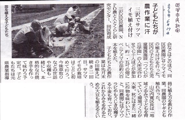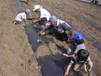 今年三沢区が新たに借りた遊休農地4a。岡谷市のトラクターで耕起してもらい、区民農園のメンバーで草をひろいマルチをして準備。その畑で、土曜の午後の炎天下、つつじが丘学園の子どもたち7名とサツマイモの苗を植えました。林弘旦さんから植え方の説明を受けて開始。7名は皆、午前中に近くの三沢区子ども会育成協議会の畑でサツマイモを植えたばかりの体験者。ジョウロで水をかける役を交代しながら、要領よく用意した苗300本を植え終わりました。おやつのジュースを飲みながら、林さん出題の作物についてのクイズを楽しみました。